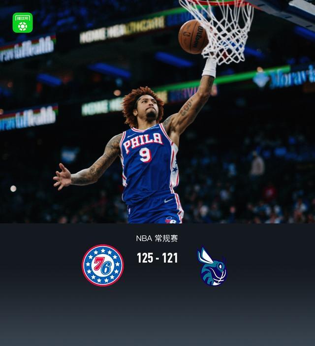 第四节76人马克西拿下12分,黄蜂卡尔克布伦纳拿下8分,最终76人125-121战胜黄蜂