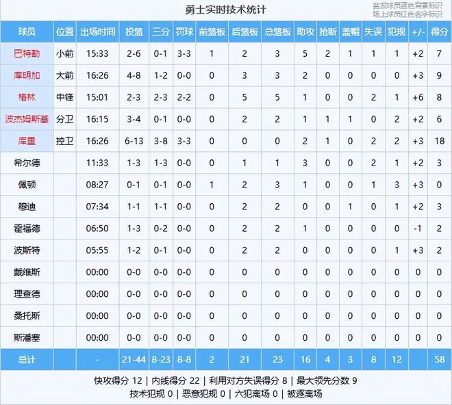 勇士数据:库里18分2助、库明加9分3板2助、格林8分5板1助、巴特勒7分3板5助2断、波杰姆斯基6分2板1助、穆迪3分2板、希尔德3分1板3助、霍福德2分2板1助、波斯特2分2板、佩顿3板1助